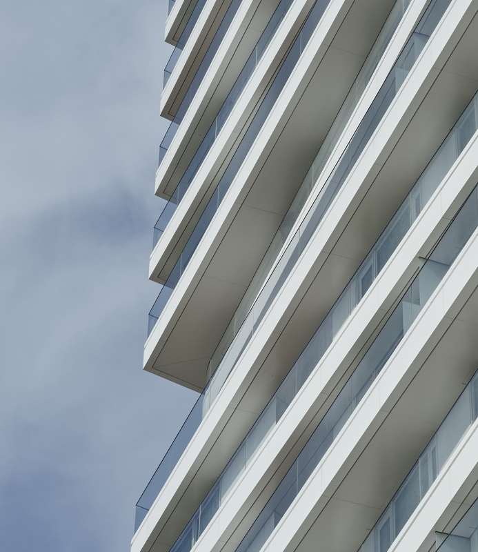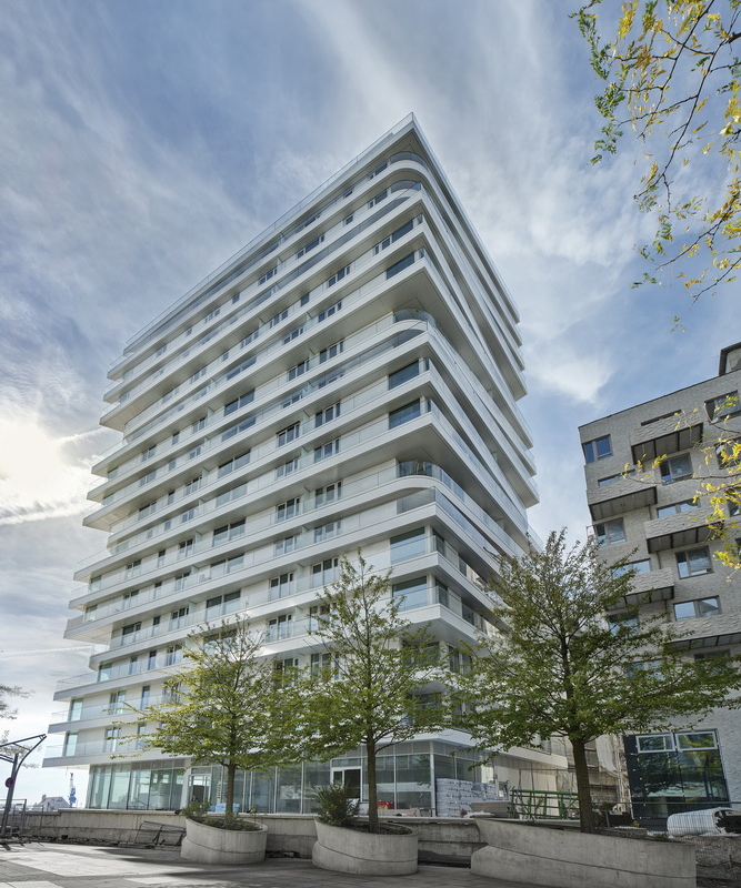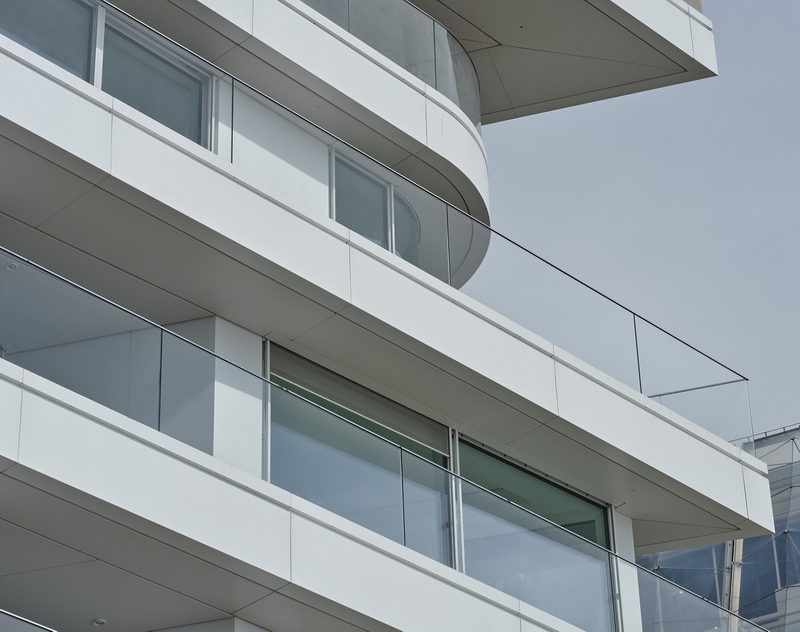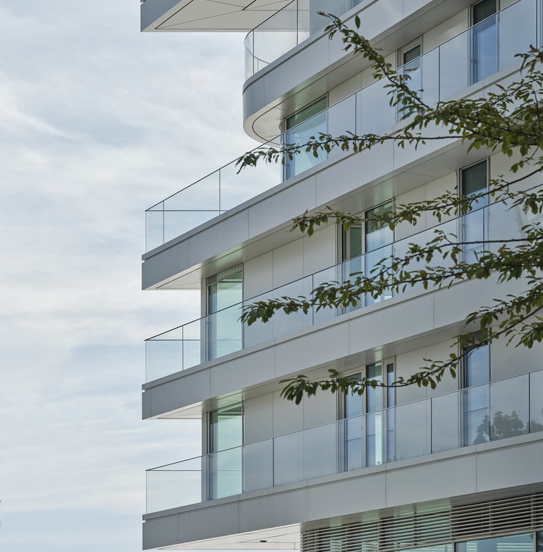 Leicht versetzte Geschosse und abgerundete Deckkanten erzeugen ein lebendiges Fassadenbild. Die umlaufenden weißen Balkone mit rahmenlosen Glasbrüstungen verstärken den maritimen Charakter.