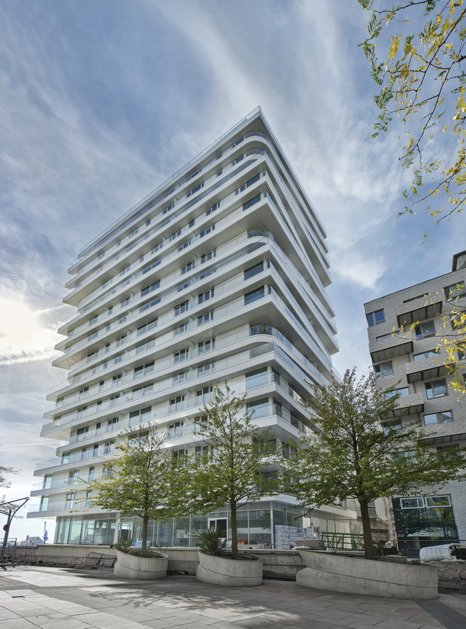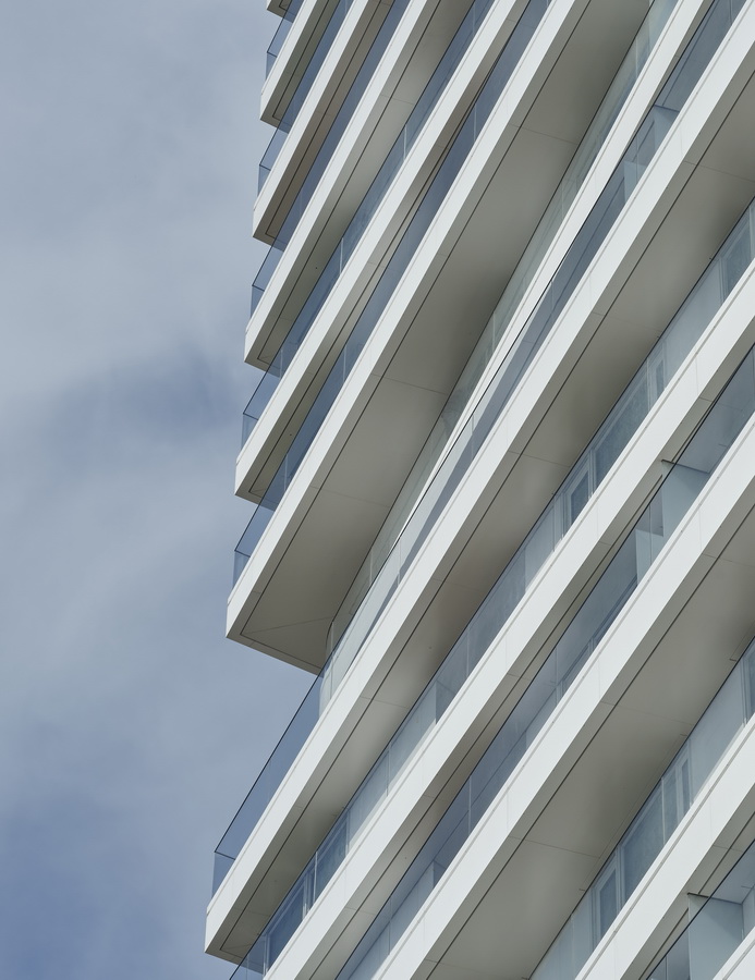 Leicht versetzte Geschosse und abgerundete Deckkanten erzeugen ein lebendiges Fassadenbild. Die umlaufenden weißen Balkone mit rahmenlosen Glasbrüstungen verstärken den maritimen Charakter.